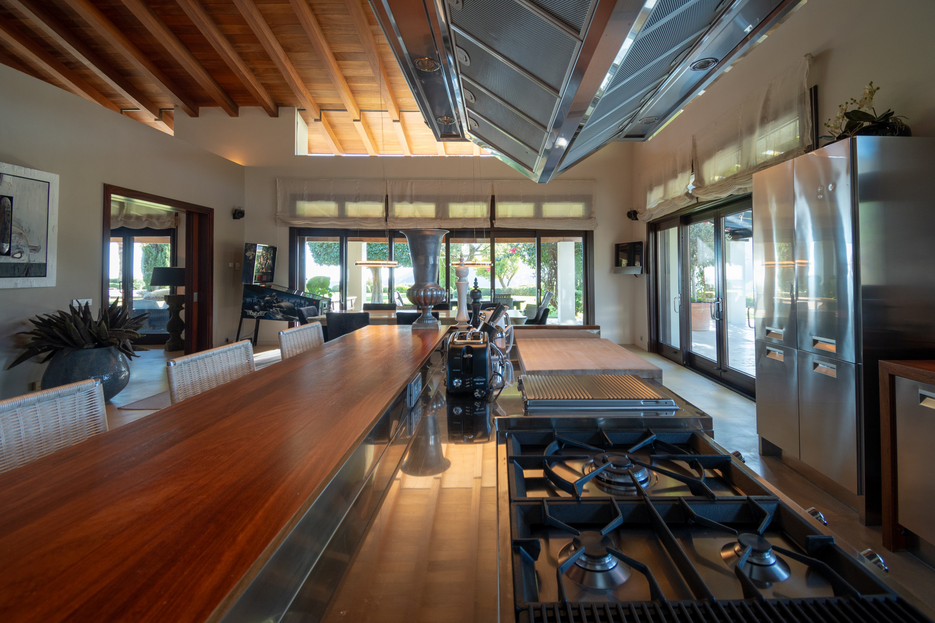 La villa est en excellent état et entièrement meublée, avec huit chambres spacieuses en suite, y compris une maison d'hôtes séparée et un hébergement dédié au personnel. La cuisine américaine entièrement équipée avec des plafonds voûtés en bois s'écoule parfaitement dans la salle à manger et sur une terrasse privée à travers des portes bi-pliées, créant ainsi l'expérience de vie intérieure-extérieure ultime.
